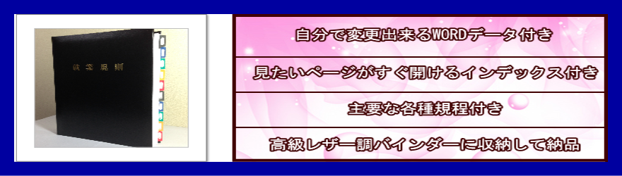 就業規則をいつでもご自身で変更出来るようWORDデータを付属させて頂いている他、お客様が見たいページがすぐに開けるようにインデックスまでつけさせて頂いております。主要な各種規定もふんだんに付けさせて頂いておりますし、高級レザー調バインダーに収納させて納品させて頂いております。